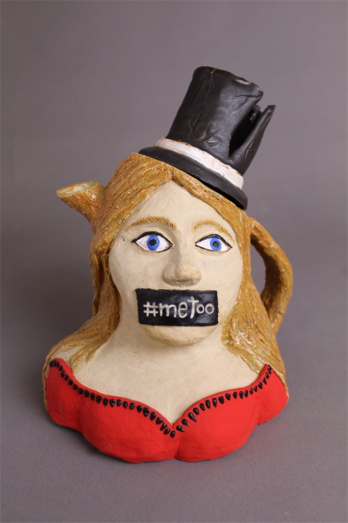 | Description: | In this teapot commenting on the "me too" movement of women finding strength in their voices and the shared stories of others in the face of sexual harassment, the distressed and broken top hat represents the erosion of male power in the workplace. |