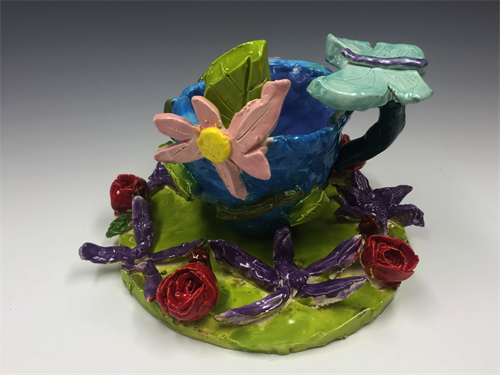 | Description: | The 2nd grade students were challenged to model a theme to adorn their whimsical teacup and saucer. This student sculpted a lush flower garden surrounding the teacup and saucer. |