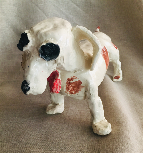 | Description: | The artist created a full sculptural Dachshund using additive techniques. She studied our real studio dogs, Ozo and Cali-dog, to developed accurate musculature and details. The hot dog costume is an important part of her piece, but she hopes the jurors will consider the dog both with and without it's costume on it's back. |