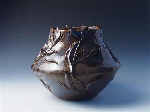 | Description: | Hand-coiled vase, applied relief, sprayed on glazes. |