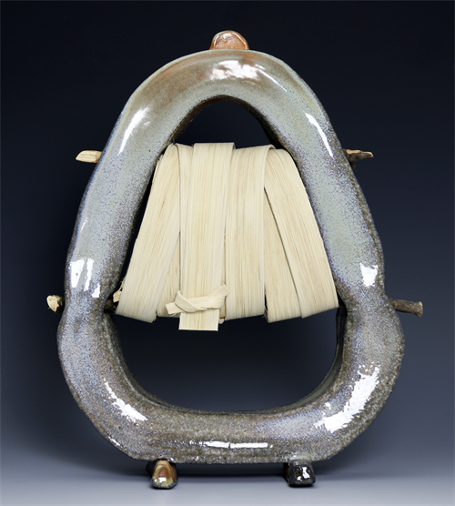 | Description: | Thrown donut form and altered; cane-reed woven between two wooden sticks. |