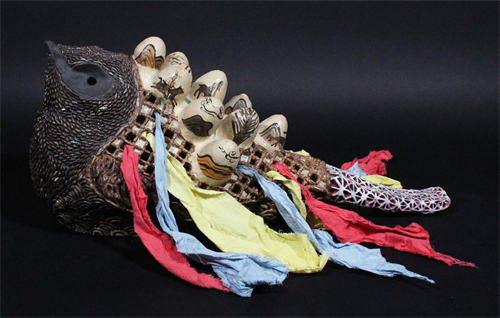 | Description: | A bird with meticulous carvings has cones on its back with traditional painted images. The bird is adorned with brightly colored fabric flowing from each side. |