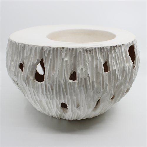 | Description: | Thrown double walled vessel assembled with a slab top and carved, glaze fired |