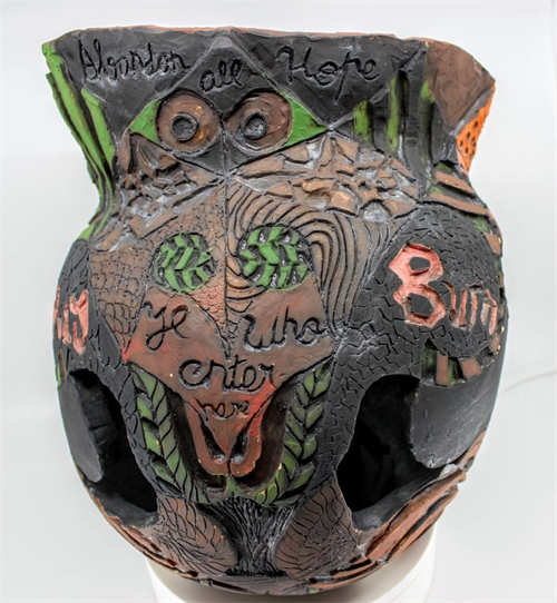 | Description: | Handbuilt, underglaze, stained and glazed Double-walled Vessel sculpture with carved, painted and sculpted details |