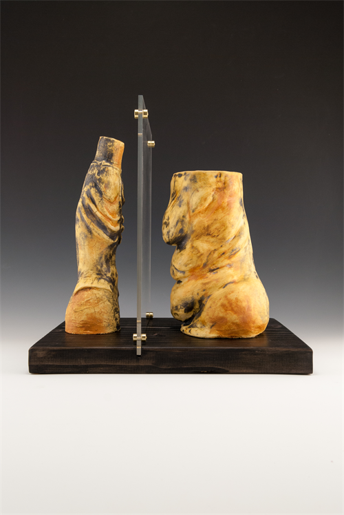 | Description: | This piece contains two hand built figures sculpted from raku clay. They sit on a piece of pine wood which is stained black, a plexiglass sheet sits in a carved line in the wood between the two figures. |