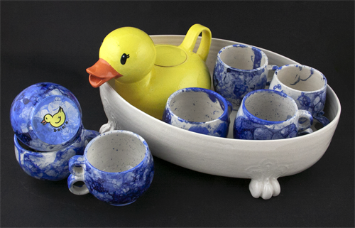 | Description: | Rub-a-dub-dub Teapot. Made with low fire clay. Hand painted with Amaco underglazes. Wheelthrowing cups and closed form duck teapot. Handbuild bathtub tray with slip trailed claw feet. |