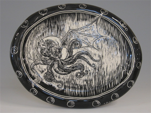 | Description: | Lowfire press-molded platter with black under-glazes graffito drawing. |