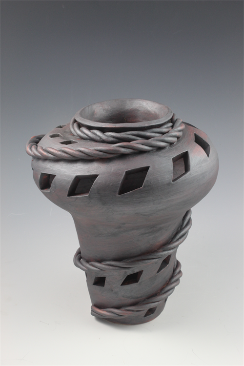 | Description: | Coil-built vase with cutouts with iron oxide patina |
