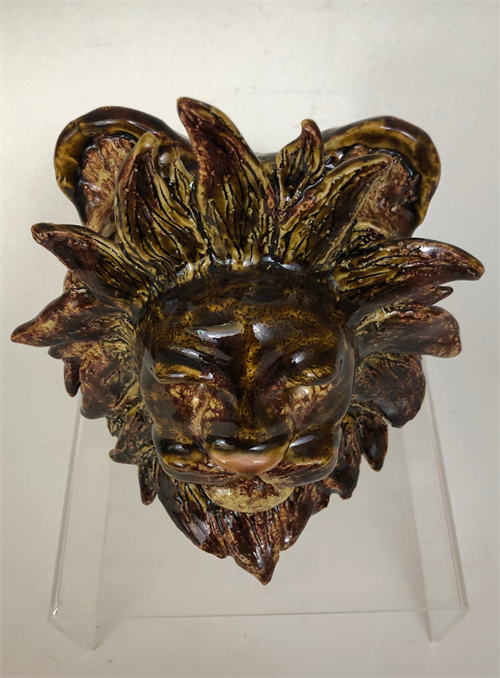 | Description: | I made this completely out of clay by carving away the facial structure from a block of clay and then adding on texture for the maine. I glazed this with layers of yellow and dark browns as well and a bit of pink for the nose. It took a long time but was fun work! |