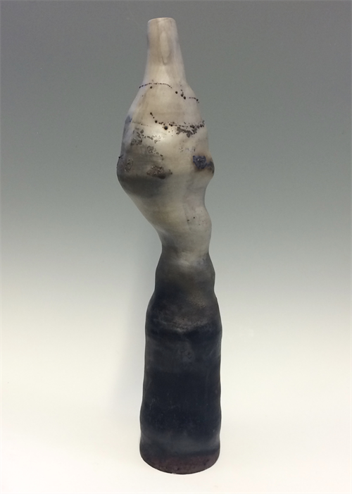 | Description: | Wheel-thrown bottom half with coil built top half, sagger-fired at cone 10 in a reduction gas kiln, in sawdust mixed with copper oxide and carbonate, seaweed and copper wire. |