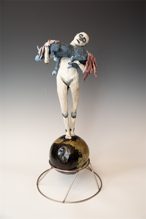 | Description: | Handbuilt sculpture made of cone 6 stoneware decorated with Amaco underglaze with wire base. |
