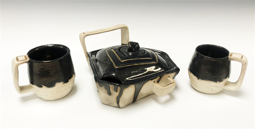 | Description: | This tea set is constructed using both handbuilt and wheel thrown techniques. The teapot itself is constructed with slabs to accentuate the geometric form. The cups are wheel thrown with geometric handles that connect back to the style of the teapot. The set is glazed with highfire glazes but the handles and lower exterior are left as the raw clay body for a natural feel. Gold luster is used to accentuate the carved lines. |