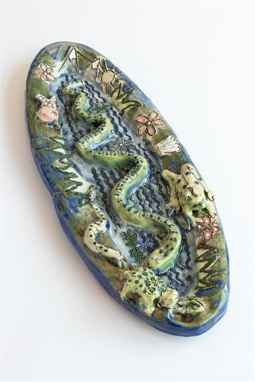 | Description: | Platter mold used to build basic form and then modified. Glazes and underglazes were used. |