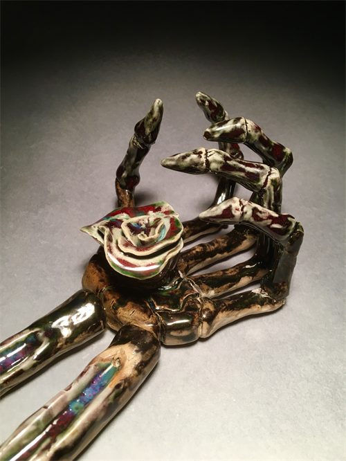 | Description: | This piece was hand built by individually sculpting each bone, and slipping and scoring them together to create the complete hand and forearm bones. The skeleton hand is holding a flower in honor of the Day of the Dead, "Dia de los Muertos". |