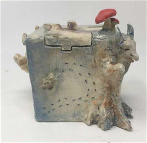 | Description: | blue and gray sculptural box with animals, reptiles, mushrooms on top and incised designs |