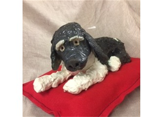 | Description: | This dog was a labor of love during which I learned that good attention is embarrassing for even younger kids. I showed his piece to explain excellent thick fur texture, which apprently mortified him. He wouldn't talk to me for 1/2 and hour. When he calmed down, he explained what happened, so our interrelationship trust grew tremendously. He is now an extro-verted, and dedicated sculptor, who has come to my classes weekly for over a year. Phew! He sewed the dog bed all by himself at home, and decorated the corners with glitter glue. |