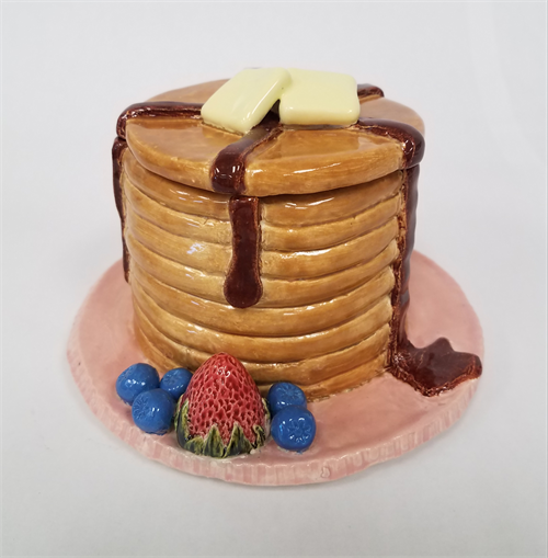| Description: | Hand built coil method lidded dish with a pancake theme. Atttention to details show in the little pieces of fruit at the base of the pancakes. |