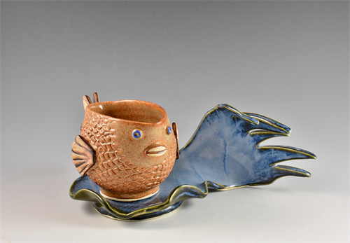 | Description: | Wheel-thrown and altered cup with hand-carved scales, attachments, sitting on a hand-built "wave"; measurements reflect cup sitting on the wave |