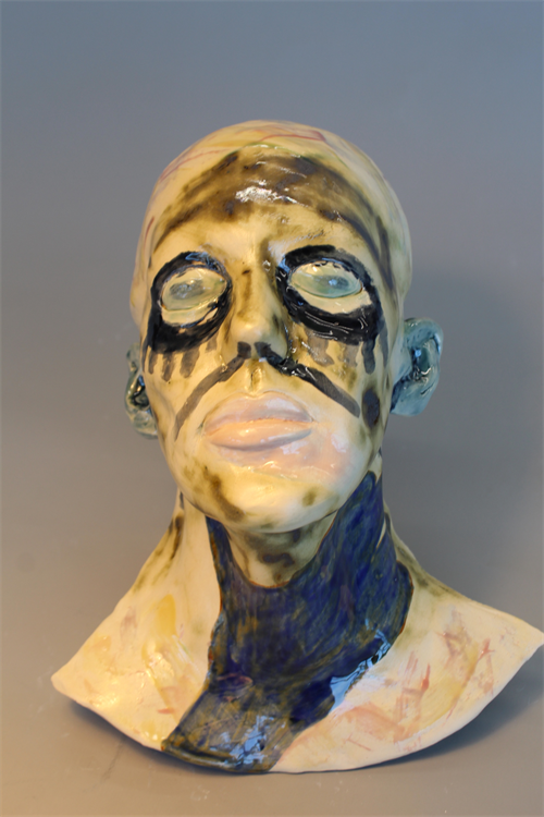 | Description: | This work was hand-built using slabs and a body cast mold. The human form was then altered to change the facial structure and details were carved. The final surface of ceramic stains and glaze was applied to further communicate the idea. The idea surrounds domestic violence, abuse, and the mental state it creates for the victims. |