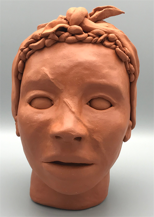 | Description: | I constructed this head using a wooden stand with a masking-tape-wrapped newspaper ball at the end. I covered the ball with terra cotta clay, mapped out some rough features, and then cut the head in half and took the newspaper out of the center. I carved the excess clay from the inside of the two halves, before reattaching them via slipping and scoring. At this point I also constructed a neck with smoothed coils, and attached the head to the neck. I then began to work on the more detailed features, such as the hair and the headscarf. I chose to use terra sigillata on "Still Here" because I had limited time, and I felt like this piece deserved a very meticulous style of glazing, which I was not able to provide due to Covid 19 surge sending us into remote learning. I decided to use terra sigillata because it lets a piece appear 'finished' without detracting from the structural elements. I was inspired to create Still Here after reading Beloved by Toni Morrison. I wanted to explore the idea of the past interrupting the present in a sculptural piece, so I decided to create a black woman who could be living in any time period, but who bore the past clearly on her countenance. In Still Here, I wanted to portray the idea of the past influencing the present, not necessarily her past specifically, but rather to the violent and unjust past of people of color as a whole. |