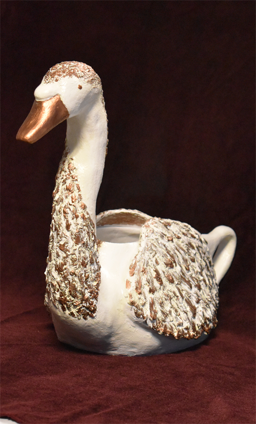 | Description: | A fully functional if oversized teapot, this piece is modelled closely on a mute swan with the beak serving as the spout of the vessel. Created through a combination of slab and coil techniques, it is covered in acrylic paint, accented with metallic copper paint, and varnished to a satin finish. It draws inspiration from the regal beauty of the swan, and how this beauty can be juxtaposed with the everyday utility of a teapot, highlighted by the emergence of a handle from the otherwise flawless body of the bird. The twining metallic design symbolizes how currents of elegance flow through everyday life, with the piece as a whole demonstrating both the possibilities of glamour in the ordinary, and the down to earth utility of the exquisite. |