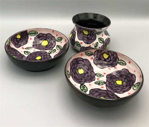 | Description: | This is a set of three wheel thrown vessels, two bowls and a vase. I used low fire terra-cotta clay and Envisions glazes. The three objects are united by the purple floral design. I used a combination of brush work and piped details. I began throwing on the potter's wheel last year. The bowls are approximately 5 and a half inches in diameter and the vase 4 inches in diameter. |