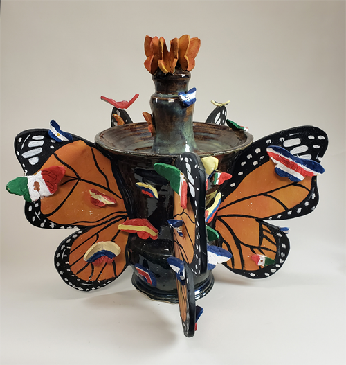 | Description: | Large vase with five butterfly wings buttressing the sides and little butterflies perched all over. |