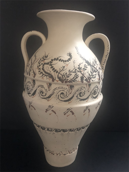 | Description: | Coiled vessel, stoneware clay, underglaze, matte glaze |