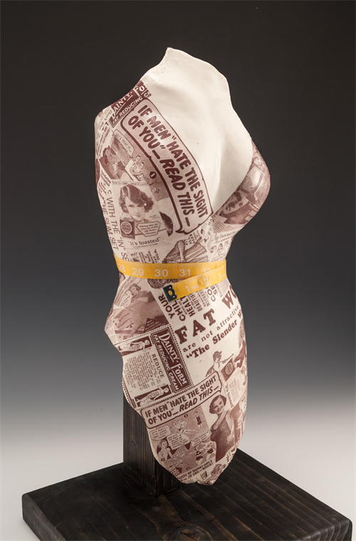 | Description: | Handbuilt female bust adorned with image transfers of shockingly offensive advertisements from the early to mid 1900s. |