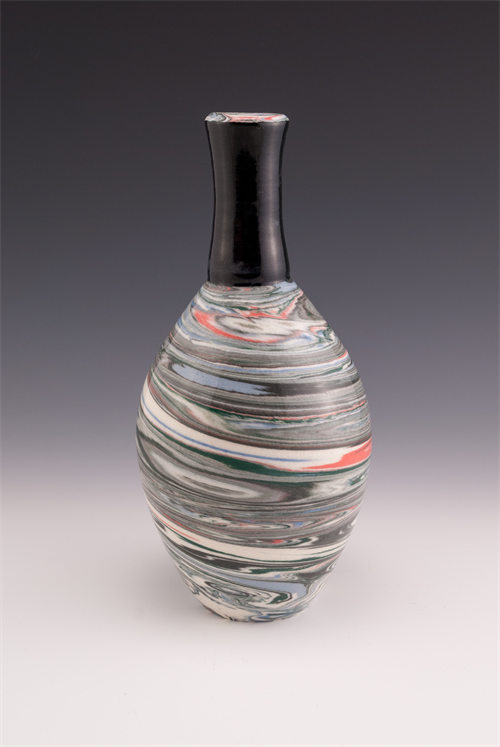 | Description: | Wheel thrown bottle with marbleized Mason stain colored clay; Masked with black underglaze and covered in clear glaze. |