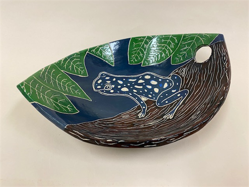 | Description: | This piece was created with a slab draped over a slump mold and under glazed with Sgraffito designs. |