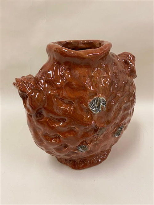 | Description: | This piece was created with a slabs draped over a slump mold textured and joined together. The rim/foot and handles were made from coils extruded. The glaze is Amaco high fire glaze applied thickly and the pot fired on a tripod stand with shells on it's side. |