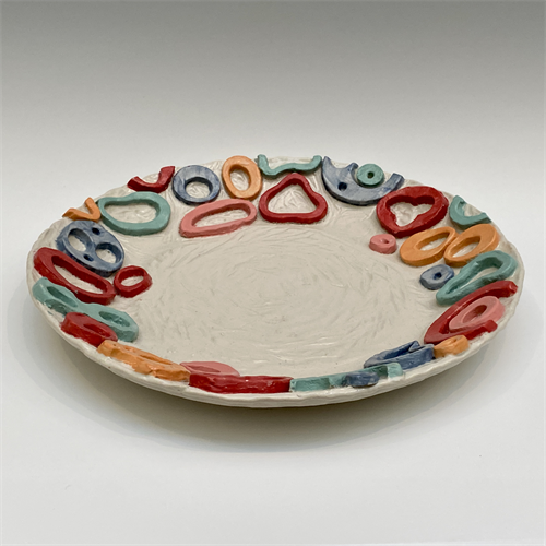 | Description: | From a series of pieces inspired by colorful African fabrics that are a part of the students' heritage. Slab constructed in a drape mold, appliquéd shapes that are painted with under-glazes. Clear glaze, cone 10 electric fired. |