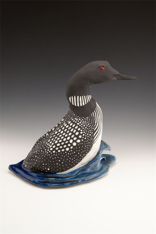| Description: | Hand built stoneware loon constructed using a newspaper core to make the body hollow. Glazed using underglazes without a glossy coating to contrast the shimmering water. |