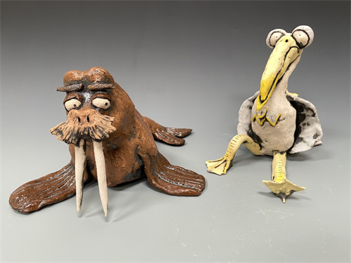 | Description: | Two hand-built ceramic sculptures portraying animal caricatures and the relationship between their differing personalities. *Measurements indicate overall dimensions and weight, which combines the two figures as one composition. |