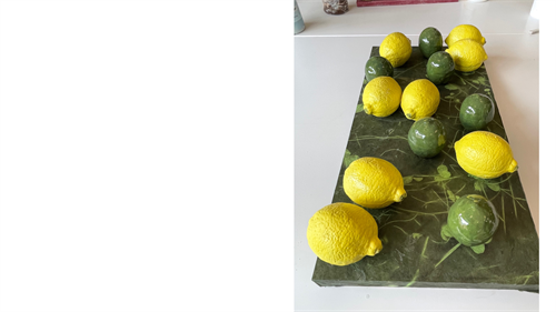 | Description: | made plaster molds of lemon and lime and cast them in stoneware slip. underglaze color with coat of clear. mounted on wood covered with rice paper |