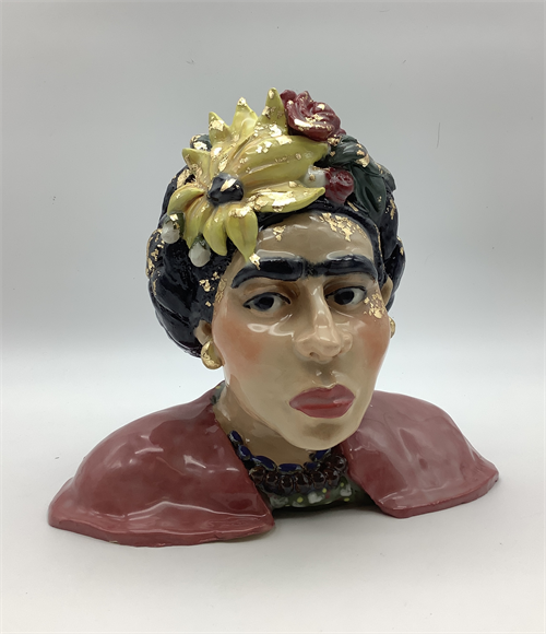 | Description: | This is a bust of Frida Kahlo that I made. This was my first time trying to make a specific person. I chose Frida Kahlo as she is one of the major female voices in Art History that I have studied that really speaks to me as a person. Trying to make a recognizable public figure proved more difficult not having a full set of reference photographs made it more difficult as could not see all angles of Frida's head in this outfit. |