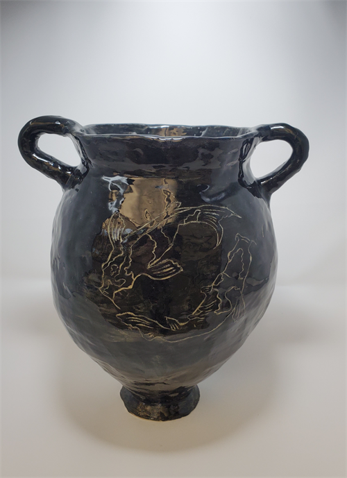 Description: I used the coil method to create an amphora which I added a design of two koi fish and a lily pad onto by using black underglaze. I took inspiration from one of my fondest and clearest childhood memories of when I visited my family in Osaka and we always went to this park with a large pond and koi fish that you could get close to by some stairs leading down the the edge of the pond. I always fed the koi fish and the beautiful lilies and lily pads are also shown on the piece.