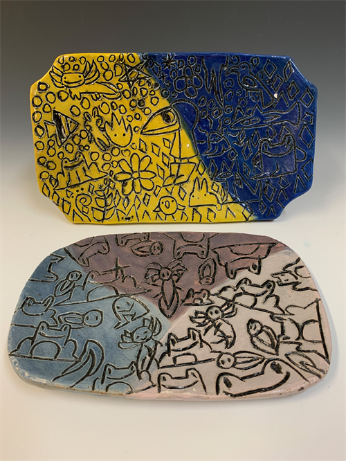 Description: Caroline used these simple forms to display her doodles and creature creations. She works in a melodic production process. She uses speedball underglaze to create her signature sgraffito designs.