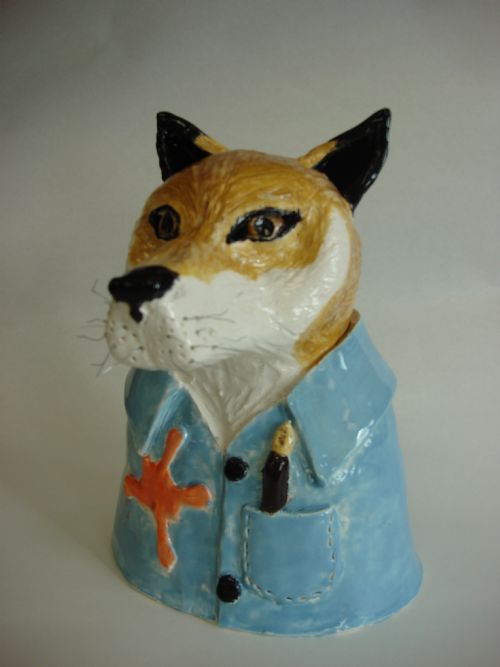 | Description: | Slab, coil, and pinch pot animal bust with wire whiskers. |