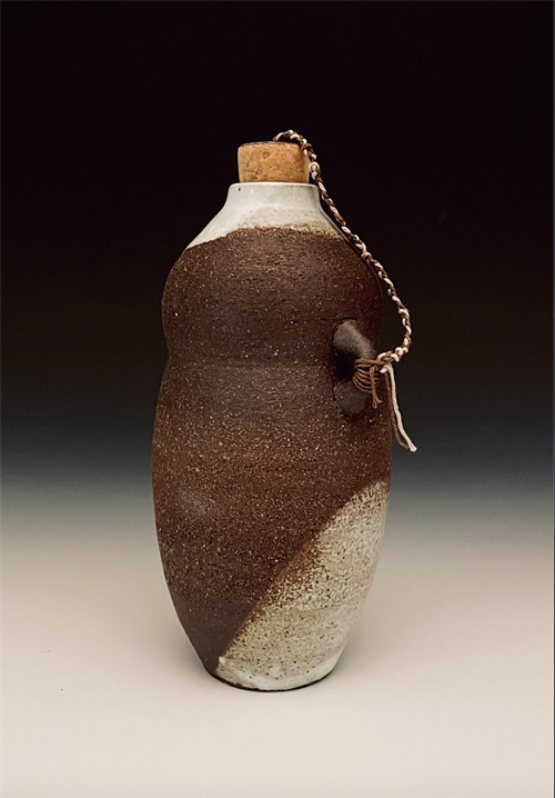 Description: Dark Clay body with white glaze accents. Hammered copper top cork and leash.
