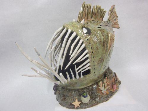 | Description: | Coil and slab cone 05 white earthenware with glazes and high temperature wire additions. Piece is textured and pierced. This piece is designed to be a lantern with an LED light to come up through the base and out the top of the head. The fish is mounted on a separate base. |