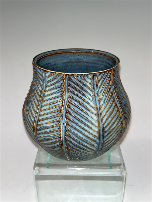 | Description: | Wheel thrown rounded cylinder with white clay, trimmed on the wheel, hand carved with round small carving tool. |