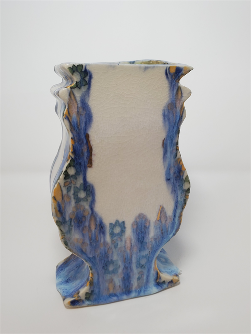 | Description: | I made a slab built vase with designs on all sides using underglaze transfer paper. I used a clear glaze for the outside and a blue glaze for the inside of the vase. After it was fired, I also added gold luster in 6 different places to highlight the shapes of the transfer paper designs. |