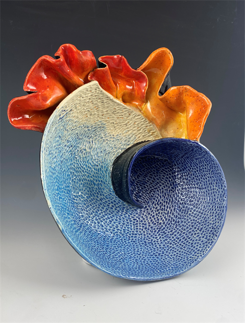 | Description: | This piece was thrown on the wheel and altered. It analyzes the balance of light and darkness and how the hues of the sunset interrupt the typical blues of the sky. I explored color, texture, and pattern throughout this piece by starting with a basic bowl and adding wavy pieces around the outside to bring more texture and represent light coming through clouds in wavy beams. |