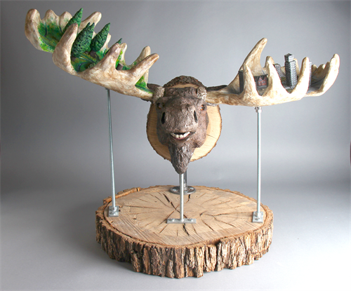| Description: | Moose trophy head mounted on tree slice with contrasting deforestation verses overpopulation on the antlers. |
