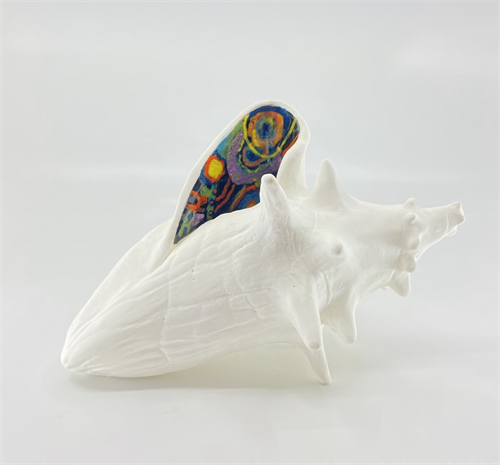 | Description: | Handbuilt conch shell with a colorful micro-macro illustration on the interior. |