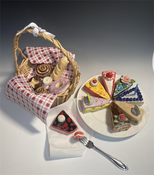 | Description: | Several ceramic pieces comprise this work of art to show different pastries and pies in a realistic fashion. It is set up more of a small installation piece. |
