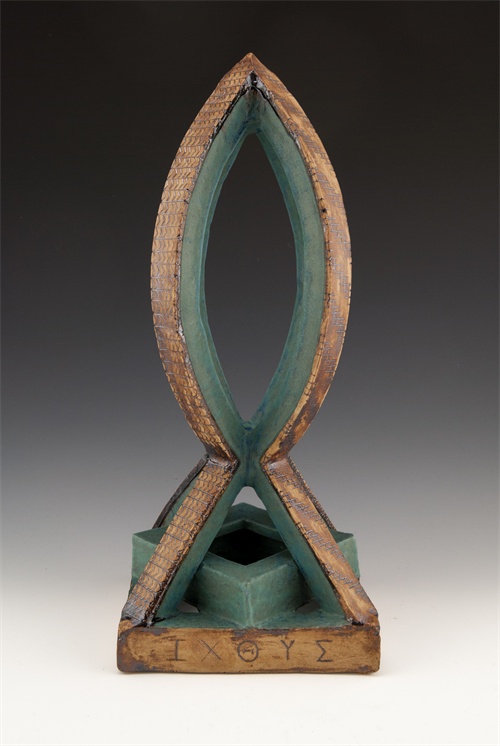 | Description: | Extruded coil and slab constructed form with fine surface etchings. Covered with satin glaze and oxide washes. Ichthys is a symbolic piece representing faith, specifically the Christian faith. Ichthys is a name for the fish in Christianity and is represented by the symbols IX (theta)Y(sigma). The origin of the symbol is said to represent to other Christians that they were not alone during the time of persecution in the Roman Empire. To me this is a proclamation of faith when atheism seems to be more popular for those surrounding me. |