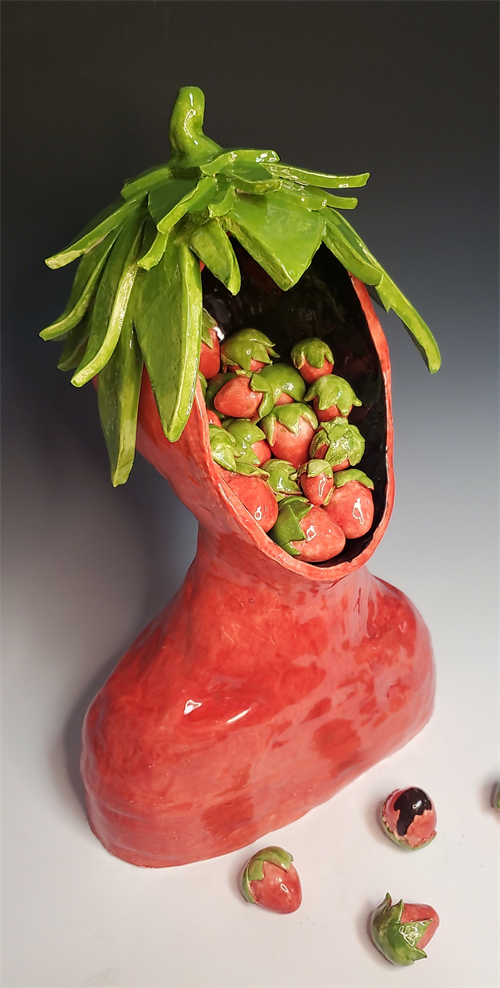 | Description: | This ceramic piece was inspired by Surrealism. An open head on top of a clay bust uses strawberries to represent the many different thoughts & feelings that make up who the artist is. |